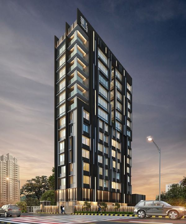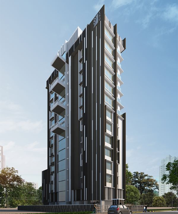Concept : Taking advantage of entire form of G+12 storeys residential building with least offsets, giving an appearance of 3 plates holding the building laterally, further enhancing it with random vertical fins & elevation bands of dual colour tone highlighting decks & glazed walls. Vertical fins help to camouflage toilet ducts with the entire elevation.